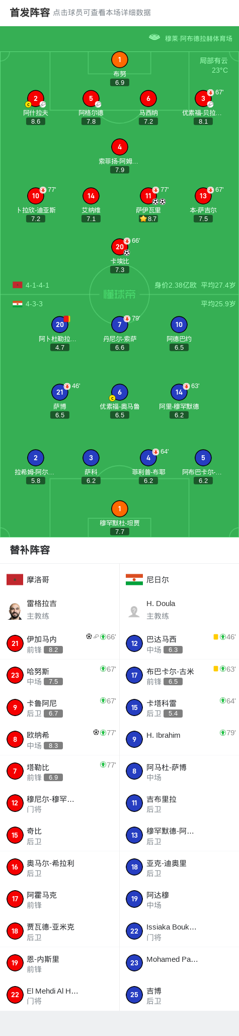 北京时间9月6日,世界杯非洲区预选赛小组赛第7轮,摩洛哥迎战尼日尔。比赛中,尼日尔球员阿卜杜勒拉蒂夫-古米在第26分钟因累计两张黄牌被罚下场,摩洛哥随后占据场上优势。 第29分钟,萨伊瓦里为摩洛哥首开纪录。第38分钟,萨伊瓦里再下一城,完成梅开二度。第51分钟,卡埃比接优素福-贝拉马里助攻破门得分。第69分钟,伊加马内由阿格尔德助攻建功。第84分钟,伊加马内送出助攻,欧纳希破门得手。 最终,摩洛哥以5比0的比分战胜对手晋级世界杯决赛圈。